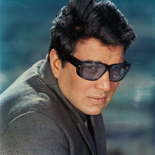 Dharmendra Portrait in a Orange Shirt and Brown Jacket with Gogles- still from the movie “Lalkar” Personal Bollywood Photography of renowned cinematographer, Shri Prem Sagar.